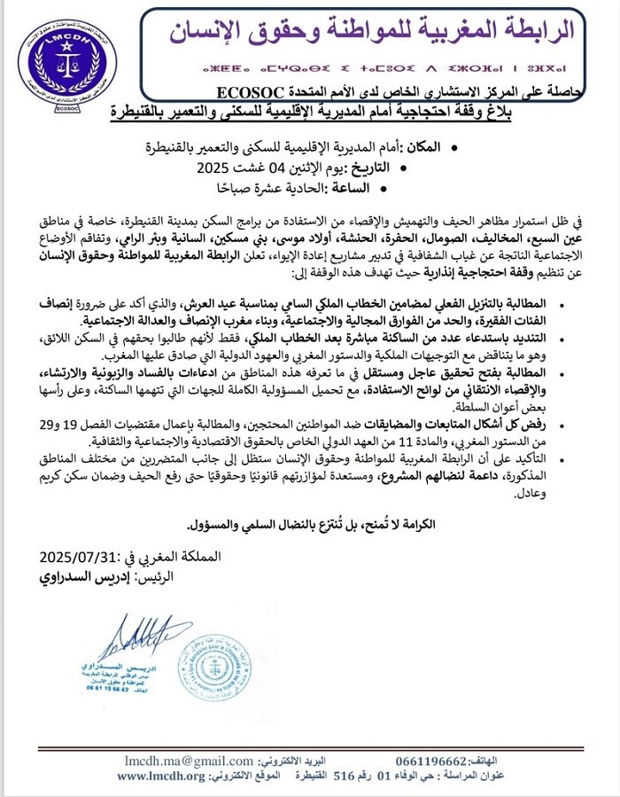 Dans son communiqué, l’Association appelle à l’application effective des orientations du discours royal prononcé à l’occasion de la Fête du Trône, qui insiste sur la nécessité de rendre justice aux catégories pauvres et de réduire les disparités territoriales. Toutefois, selon des témoignages locaux, certaines personnes ayant revendiqué leur droit au logement auraient été convoquées par les autorités après ce discours, une réaction qualifiée par l’Association d’« acte de représailles » en contradiction avec l’esprit de la Constitution marocaine et les engagements internationaux du Royaume.