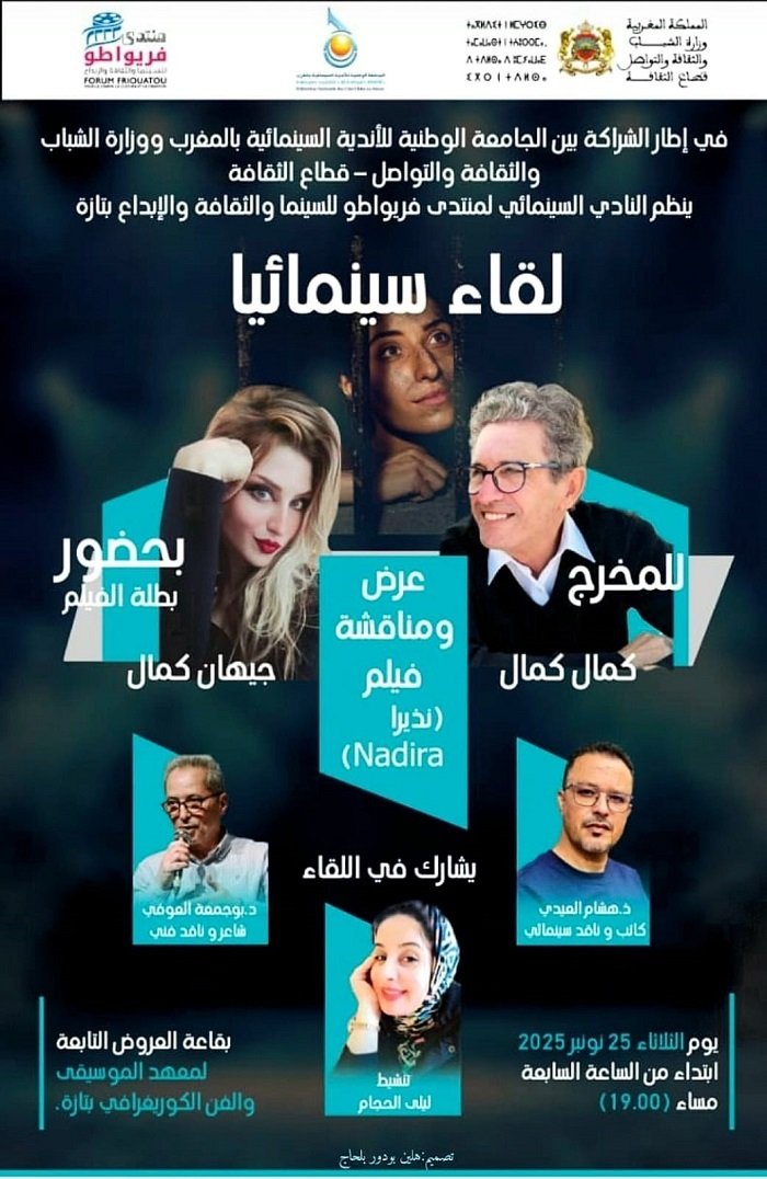 Dans une démarche fidèle à sa mission de soutien à la culture visuelle et de valorisation de la création cinématographique marocaine, le Forum Frawato de cinéma, culture et créativité à Taza se prépare à organiser une soirée cinématographique spéciale, au cours de laquelle sera présenté le film Nadira du réalisateur Kamal Kamal, dans le cadre du partenariat entre l’Association nationale des clubs cinématographiques du Maroc et le Ministère de la Jeunesse, de la Culture et de la Communication – Secteur Culture.