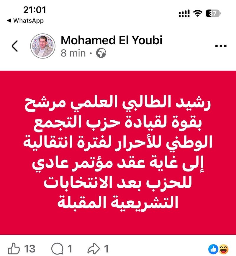 C’est précisément dans ce climat qu’est apparue une publication sur Facebook présentant Rachid Talbi Alami comme un “candidat fort” pour diriger le parti durant une “période de transition” jusqu’aux prochaines législatives.