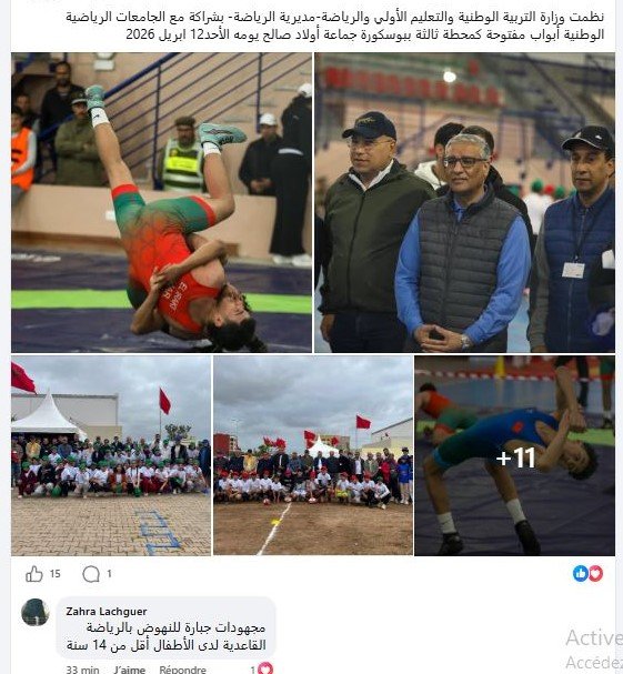 À la commune d’Oulad Salah, à Bouskoura, le dimanche 12 avril 2026, le ministère de l’Éducation nationale, de l’Enseignement préscolaire et des Sports, à travers la Direction des sports et en partenariat avec les fédérations sportives nationales, a organisé une opération intitulée “portes ouvertes”.